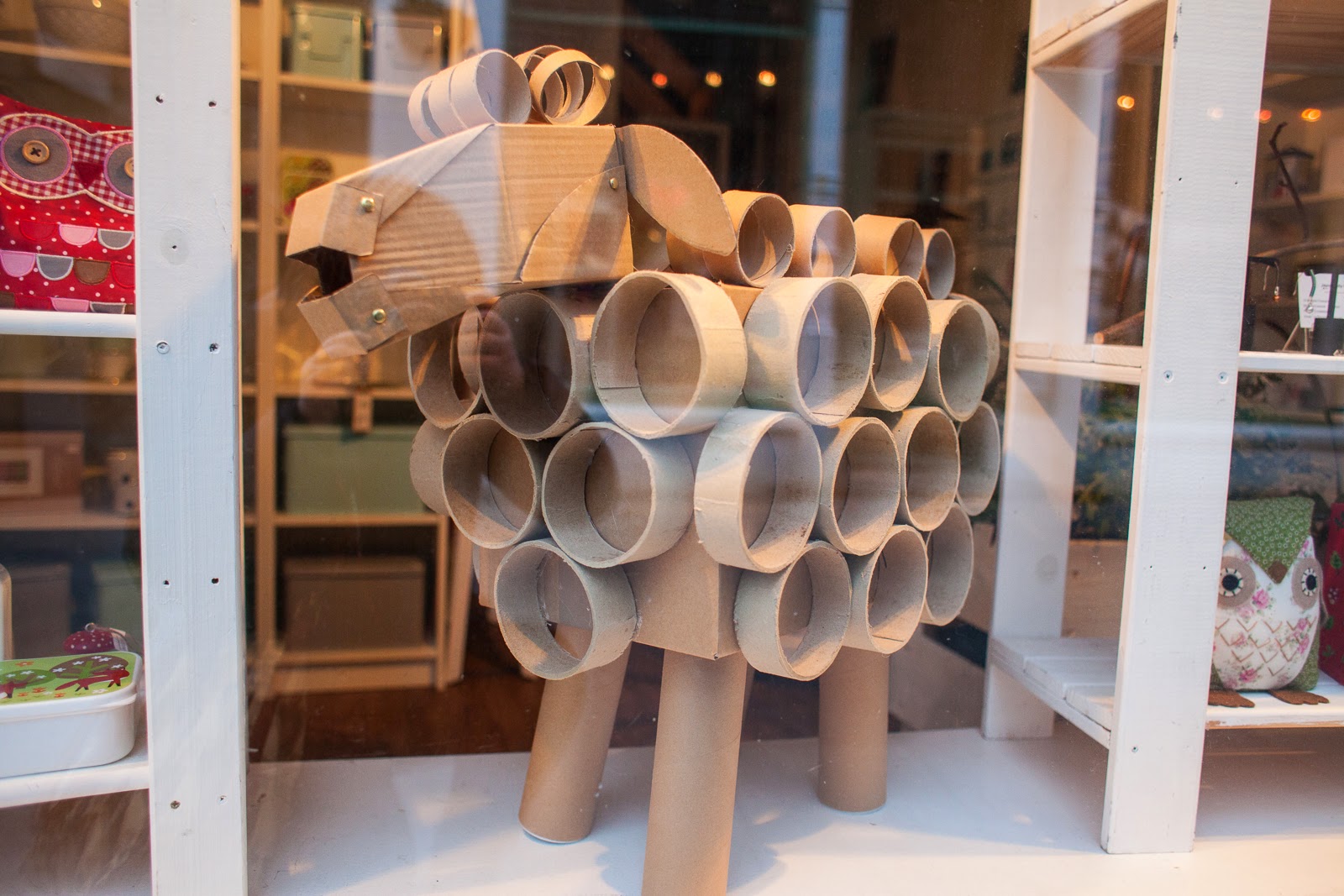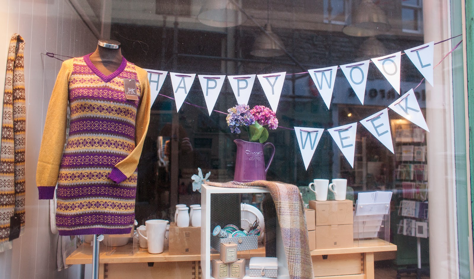 Commercial Street Týdnem vlny skutečně žila. Vlna, ovce a připomínky této události se objevovaly ve výlohách i těch obchodů, které jinak nemají s pletením vůbec nic společného (toto neplatí pro první fotku, výlohu oděvní firmy Ninian, která se snaží tradiční vzory přizpůsobit moderní době, a podle mého letmého pohledu se jí to i daří!).