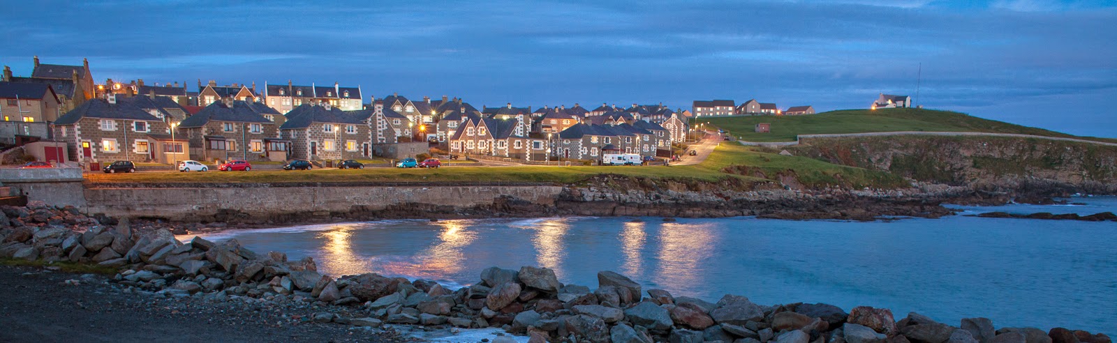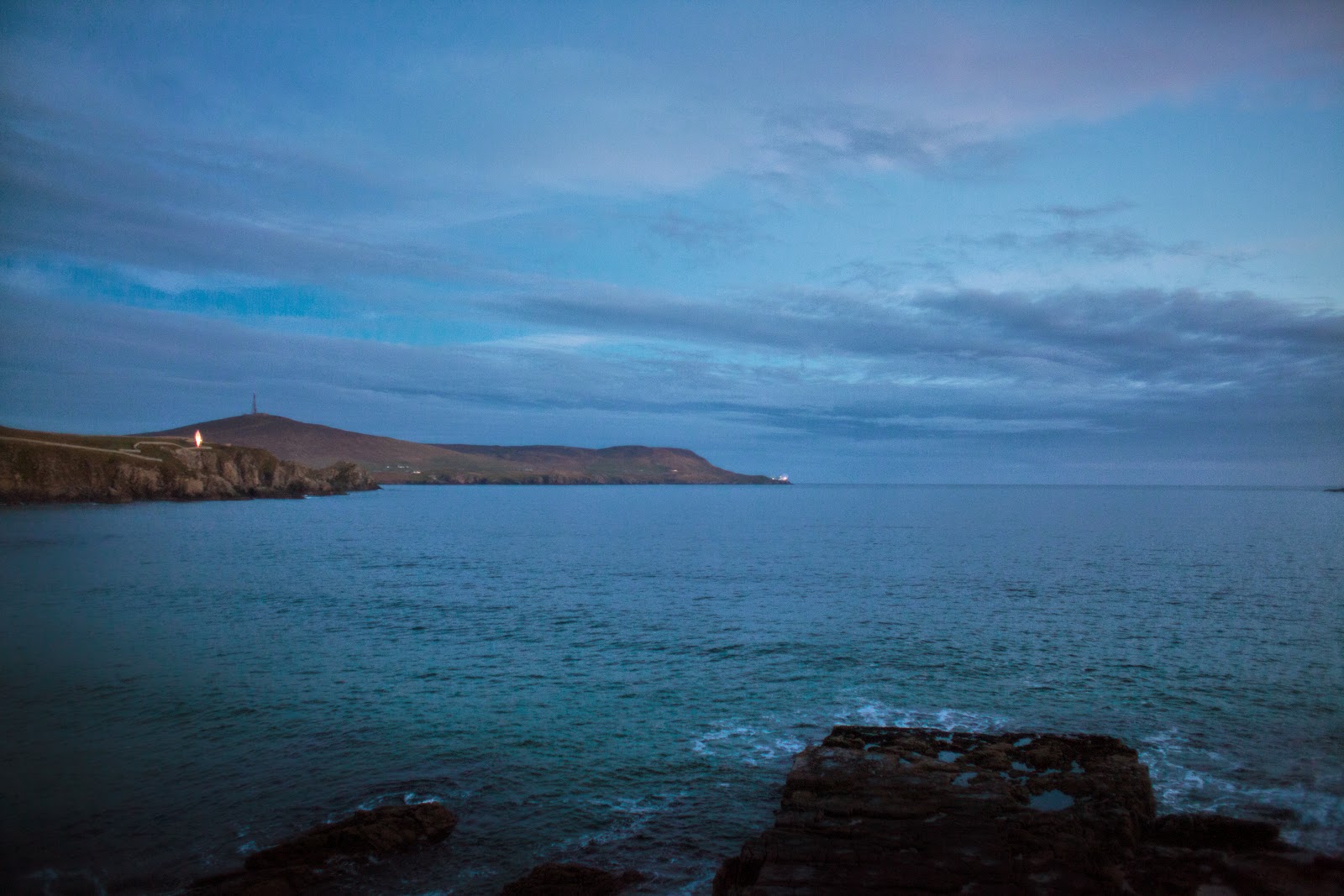 Cesta zpátky už za tmy. V dálce svítí - vlastně bliká - zhruba uprostřed obrázku maják v Bressay, jehož autorem je stejně jako v případě majáku Sumburgh Head Robert Stevenson.